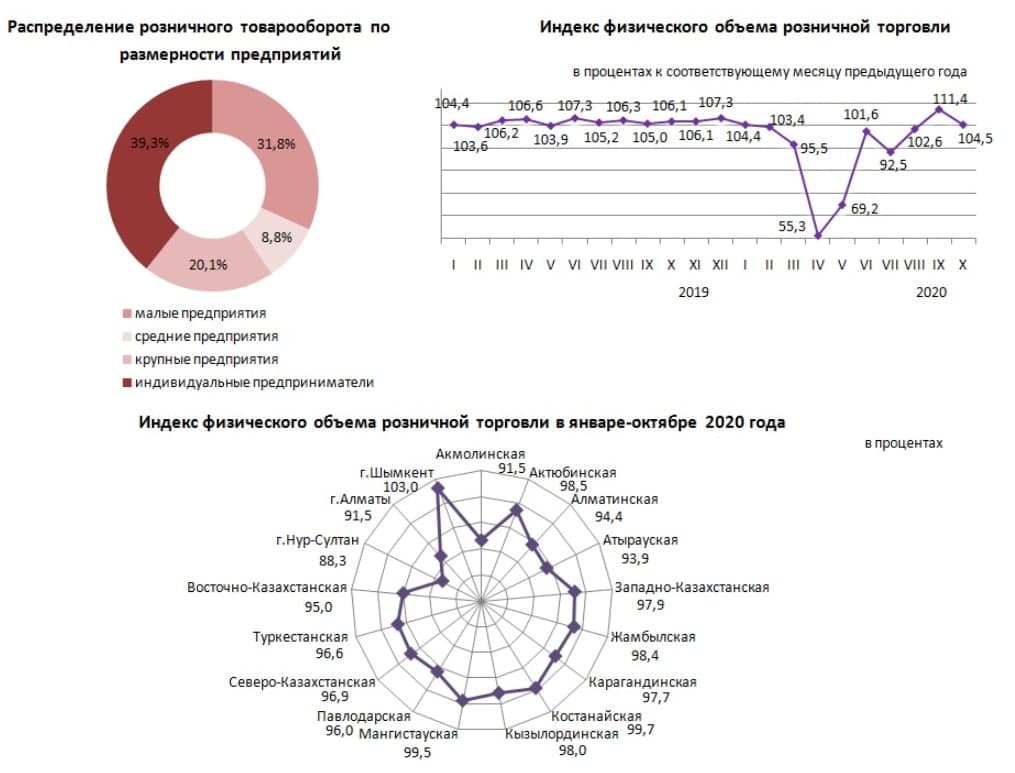 В целом, за период с января по октябрь текущего года розничная торговля в Казахстане сократилась на 5,7%, что немного лучше показателя за январь-сентябрь, который составлял -6,8%.
